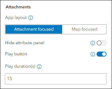 Display photos, videos, and PDF files stored as attachments alongside your map using the Attachment Viewer app template. App users can now auto-play through feature attachments in the app at a given speed. Use the app configuration to enable the Play button setting then supply a Play duration in seconds. This adds a Play button to the header over the map that can be clicked by the app user to begin the auto-play. Note that this new feature is only available for Attachment focused layouts. This is not available for apps configured using the Map focused layout.