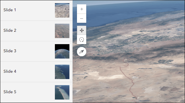 Design an interactive presentation of your map using Exhibit. Tell a linear story by choosing specific areas of your map to highlight using slides that offer interactivity options such as toggling layer visibility and choosing a unique basemap. Enable a slide list that provides a table of contents that make it easy for app users to navigate from slide to slide. New this release is a Side panel layout for the slide list. Choose this option in the app configuration to display slides neatly in a side panel alongside the map or scene.