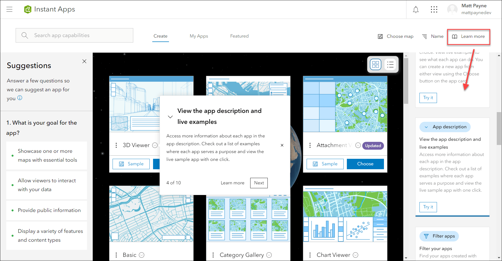 The Instant Apps home page offers a centralized place to browse, choose, create, and manage ArcGIS Instant Apps. This release we have added new onboarding messages and tips that help provide guidance and resources for using and navigating the page. A pop-up displays on the screen calling out a specific feature and offers the ability to click through to the next message or close out. All messages and information are contained within the Learn more panel accessed on the far right side of the header. Within the panel, click Try it for any tip to open it’s respective pop-up on the page.