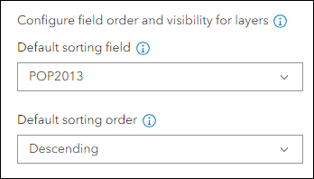 This release we have added the ability to set a sort order on a specific field in the table so that the app displays the records in the table using this order by default. Use the app configuration to set the Default sorting field and Default sorting order options on the Interactivity > Table options tab. First pick a map and then click the Field editor button to the right of any layer to access these two settings. The configuration lets you set this for each layer within each map in the app.