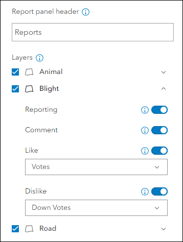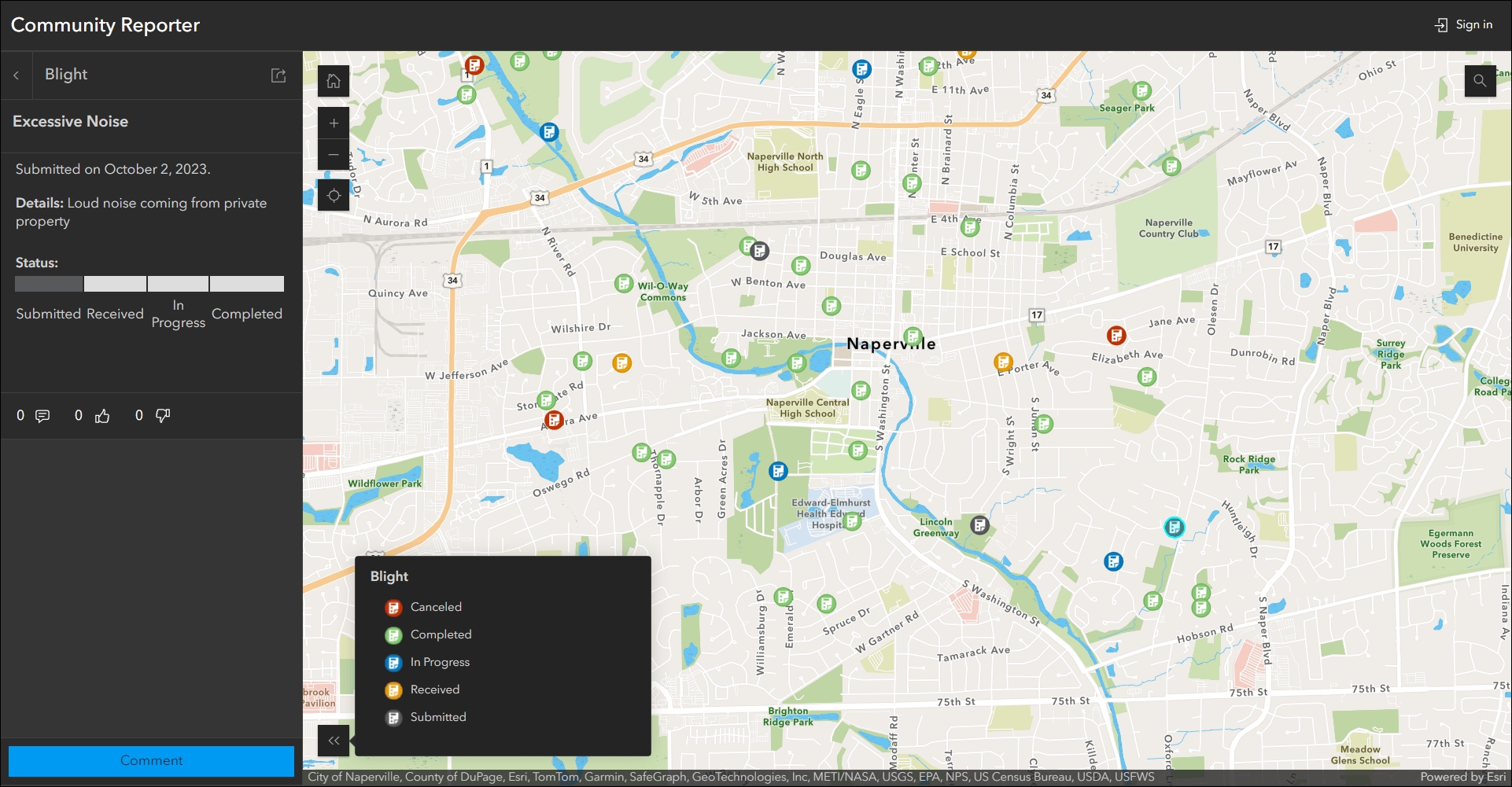 View and submit issues or observations in an area using the new Reporter app template. This new app lets users create a report that displays on the map. They can also view existing reports and use basic map exploration tools to navigate the map. New at this release is the ability to sign in to the app and provide comments and submit votes. To create an app that supports commenting, a related table record is required. Voting requires that you choose a numeric field to store the values. Set up commenting and voting on the Reporter tab of the app configuration on a layer by layer basis.