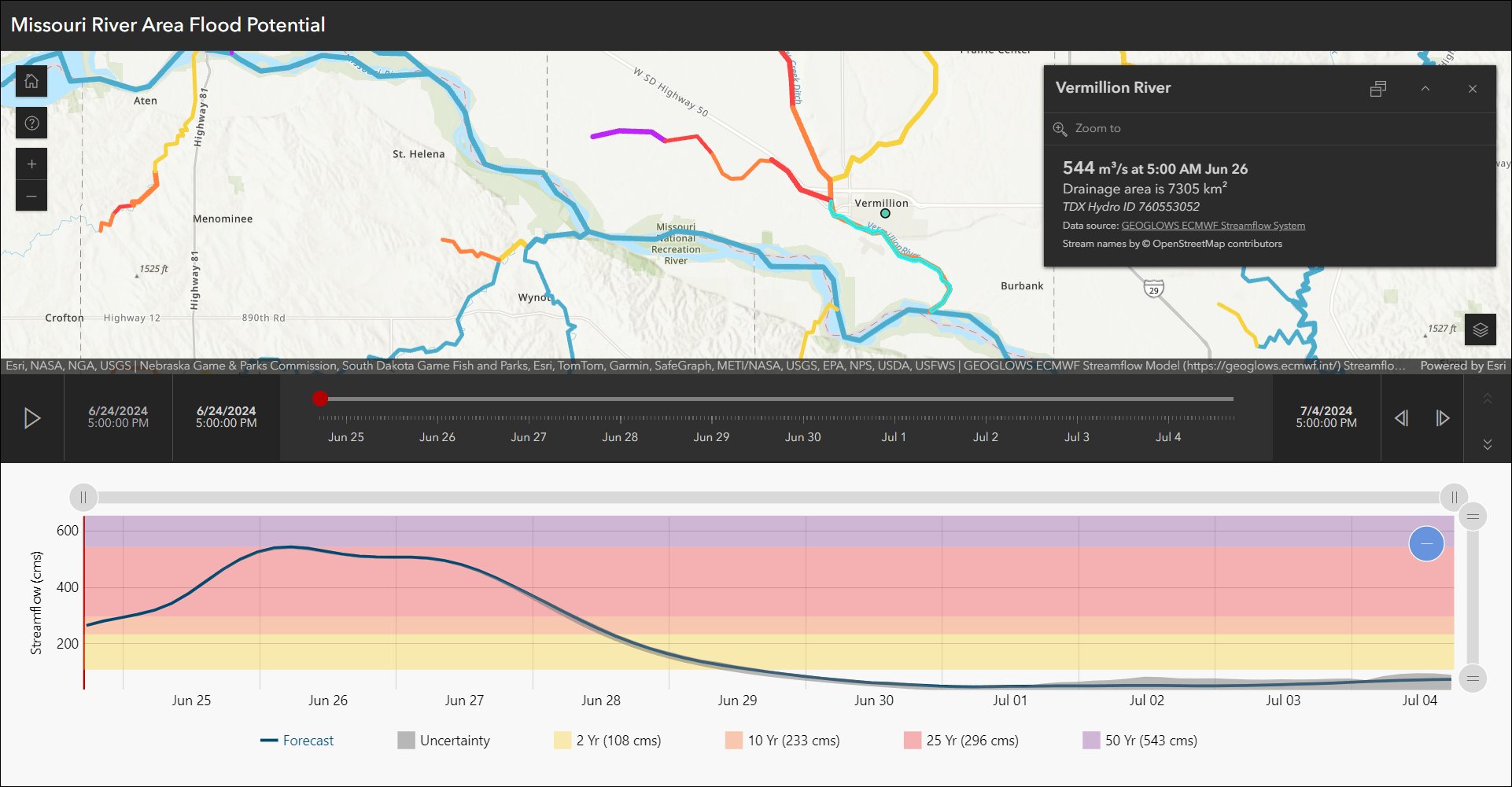 Interact with streamflow forecast data through a chart and time slider using the new Streamflow Viewer (Beta) template. This app includes a multi-day river forecast service from the European Centre for Medium-range Weather Forecasting (ECMWF) that displays data in 3-hour time intervals. App creators can generate apps that help alert users about potential flood risks with a chart to compare historical data to currently forecasted streamflow data. The Global Water Model service is updated once daily and is automatically added to your app when you choose a map or scene in the app configuration. The chart and time slider are both interactive and can be used to further explore the streamflow data in your area.