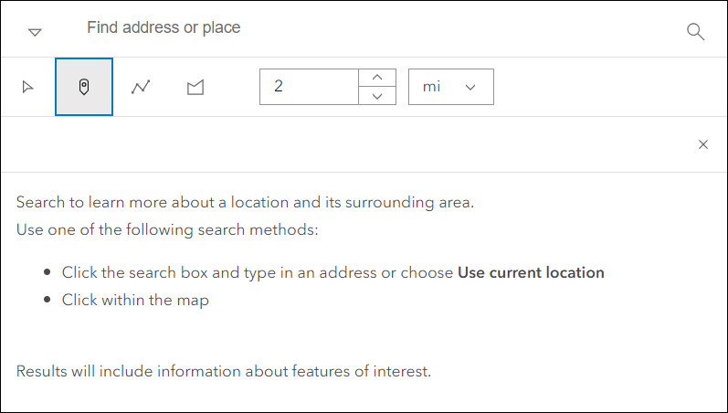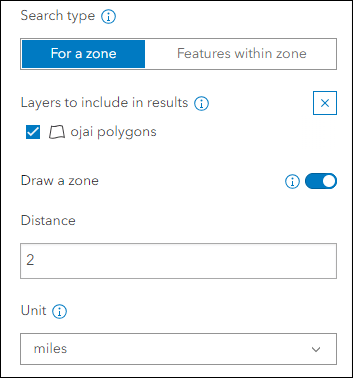Discover locations within a zone or region to provide information using Zone Lookup. This app is great for identifying school districts, store regions, emergency evacuation zones, and more based on current location or a location provided by the app user. New at this release is the ability to create a search zone by drawing a point, line, or polygon on the map. A buffer distance can then be used around the drawn sketch to find features in the map. In the app configuration, enable the “Draw a zone” setting on the Zone Lookup > Options tab. Then supply a default search distance and units for the buffer. In the app, the user can choose between point, line, or polygon to draw a sketch on the map and also change the distance or units as they explore.