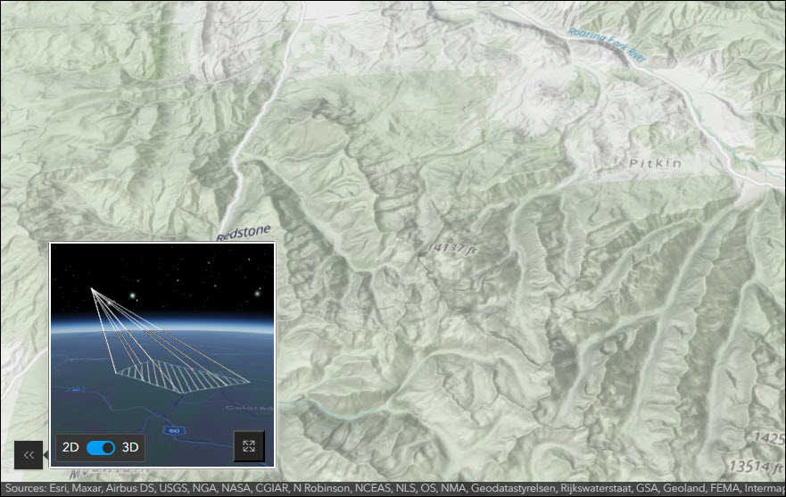 Present a 3D scene with a variety of exploration tools using 3D Viewer. We’ve updated the Locator map widget with an enhanced experience and new feature. When enabled from the Interactivity > Locator map area of the app configuration, you can now toggle between 2D and 3D views to be used while navigating. This allows for a more detailed reference of the view you are seeing in the main frame scene. The color of the view icon and prism can be configured to any color so that you can best match it with the locator map basemap of your choice, both of which are settings found in the same configuration panel.