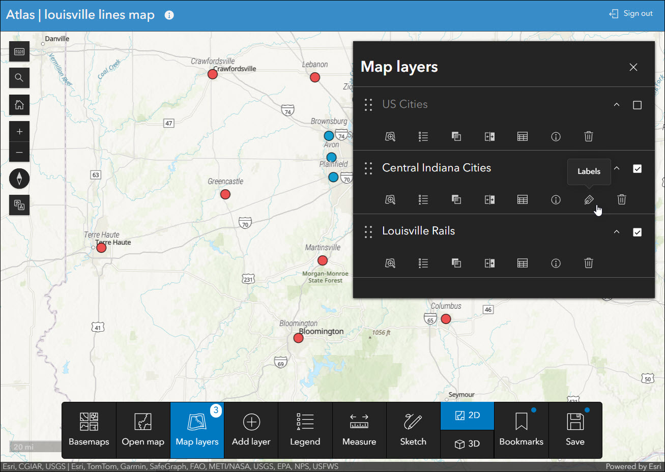 When viewing layers that have labels enabled, Atlas now offers the ability to toggle the labels on and off within the Map layers panel. If labels are detected for a layer, a Labels icon will appear next to that layer that controls the labels with a single click.