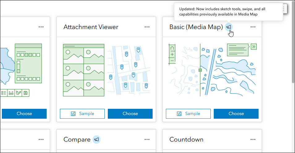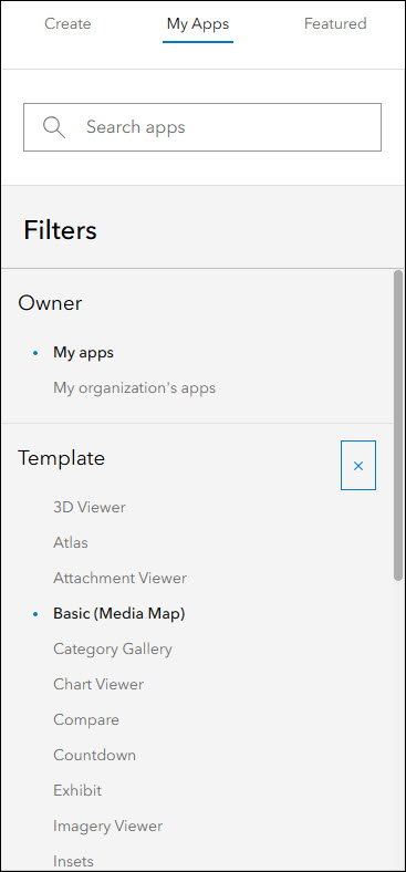 The functionalities of Basic and Media Map have been combined into a single template, now called Basic (Media Map). There is no loss of functionality between either template and all settings such as the swipe tool are available to configure in Basic (Media Map). Apps created using the original Media Map template will continue to be configurable and can easily be accessed on the My Apps tab of the Instant Apps home page inside the Basic (Media Map) filter in the side panel.