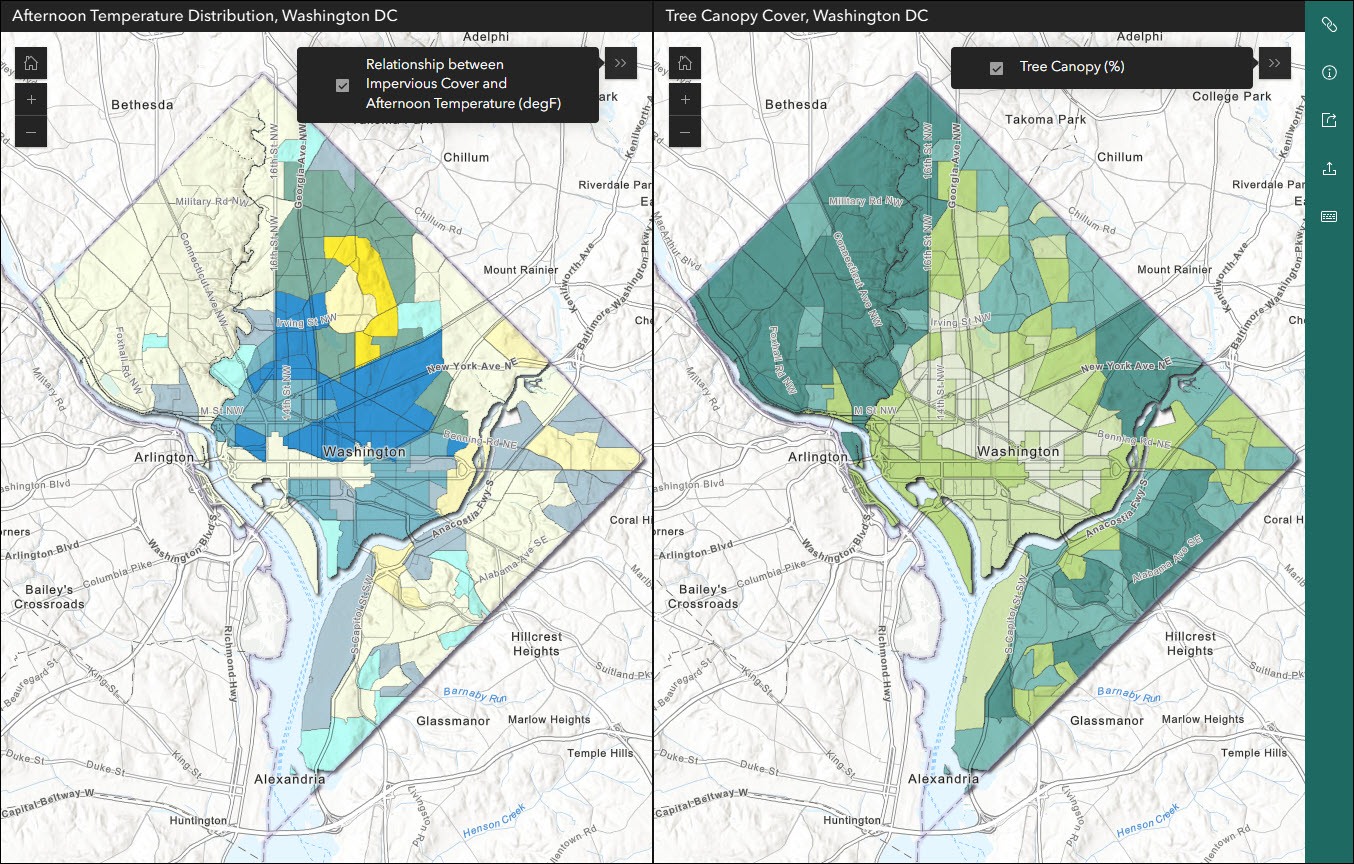 - Toolbar theming – When the app header is disabled in Compare (About > App details), a toolbar displays on the right side of the app to display tools that are universal such as Synchronize maps, Share, Export, etc. We’ve updated the app’s theming settings to apply the same theme choice to this right-side toolbar that is applied to the app header. Therefore, if you set a specific color for the header in the Theme & Layout > Theme settings, this color will still apply to the toolbar that replaces it whenever disabled.
