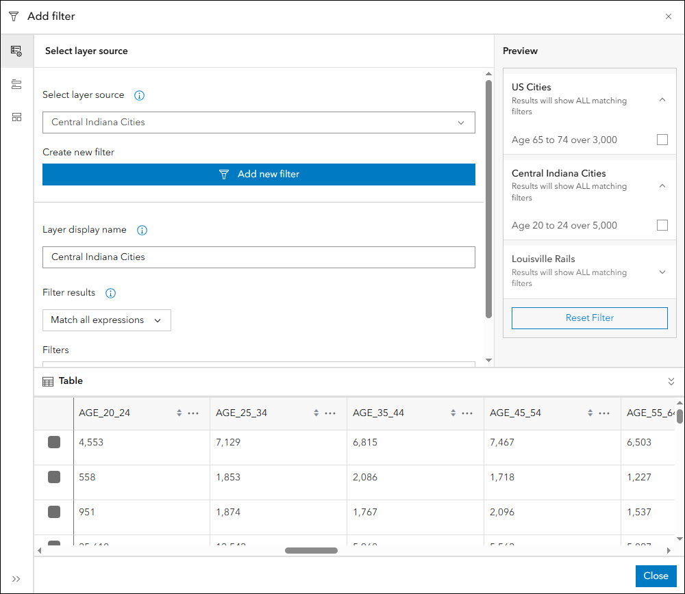 With this update we have given the attribute filter configuration experience a new look and interface. Since configuring a filter contains a large amount of settings, the entire experience has been moved out into its own take-over window directly in the configuration instead of contained within the panel. This makes it easier to see what filters you are setting up and even get an automatic preview of how they are going to look in the app before saving. We’ve also added the ability to view the attribute table to use as reference during the process. Functionally, all options and settings within the attribute filter configuration are the same, but creating useful filters in your apps has been made more simple.