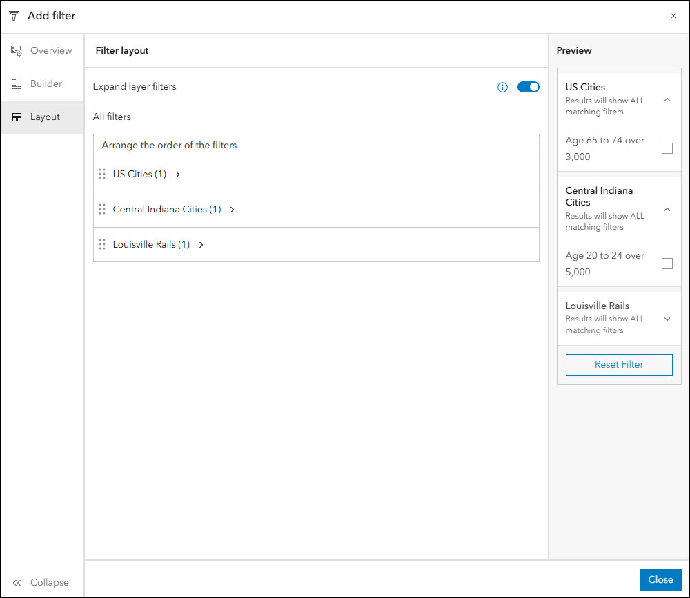 The attribute filter feature is included in most Instant Apps templates and lets app authors configure the way that data in the app is displayed. Set up predefined filters or configure user input filters that prompt app viewers to choose how they want to filter the data they are seeing.