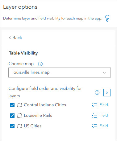 - Layer list – The Layer list tool has been added to Multiple maps mode. Enable the Layer list to add the tool to each map or location you have in your layout and use it to toggle the visibility of layers in the map. Optionally, choose between Eyeball or Checkbox as the layer visibility icon from the app configuration.