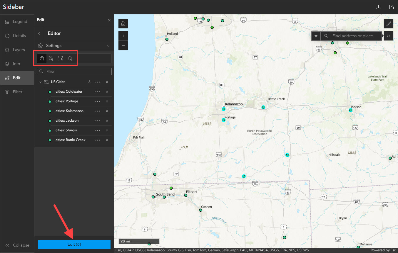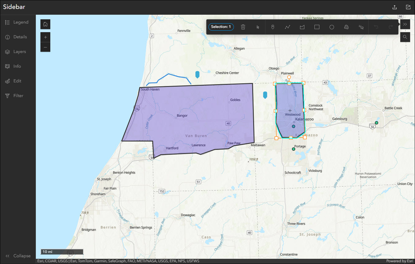 Sidebar offers a range of tools for exploring, understanding, and managing data. Like the Manager template, Sidebar also supports batch attribute editing. Use the editing panel to select multiple features from the map and apply attribute edits in batch. Choices to select features include Select by rectangle or Select by lasso. Note that batch editing can only be performed on a single layer, so keep this in mind when selecting features in maps that have multiple layers.