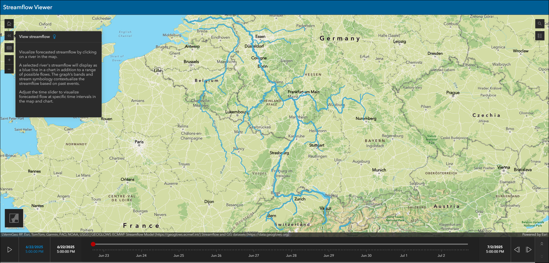 Interact with streamflow forecast data through a chart and time slider using the new Streamflow Viewer template. This app includes two different 10-day river forecast services, the GEOGLOWS Streamflow forecast service for global coverage from the European Centre for Medium-range Weather Forecasting (ECMWF), and the United States National Water Model service for US coverage from the National Weather Service.