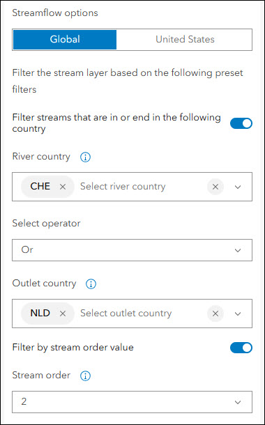 Choose to filter the stream layer in your app using preset filters. For both forecast services (Global and United States), choose to filter by stream order. The stream order value measures the relative size of streams where the higher the value, the larger the stream. Use the preset filter on the Streamflow Viewer tab of the app configuration to choose a stream order value from the drop-down and streams of equal value or more will show in the map.