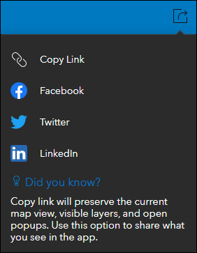 Also new in Attachment Viewer is an updated sharing widget. We have improved and refreshed the sharing menu that includes social sharing options, the ability to generate a link, and the option to embed. The Copy Link option will preserve the current map view, layer visibility, and open popups. Use this option to share what you see in the app. To include this new sharing widget in your app, enable the Social sharing option in the configuration of your Attachment Viewer app.