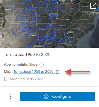 Also new in this release is the ability to open webmaps, web scenes, and groups that are used with your existing Instant Apps. On the My Apps tab, each one of your apps lists the map, scene, or group by name that is used for that particular app. Clicking on this hyperlinked name will launch the respective resource in it’s appropriate viewer. Webmaps will open in Map Viewer, web scenes will open in Scene Viewer, and groups will open to the group’s Overview page. For example, this makes it easy and direct to find out which map is being used in your app and then the ability to quickly edit it and make desired changes.