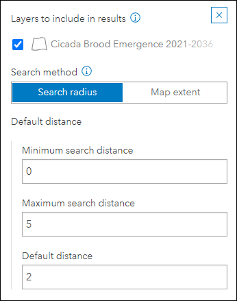 We have improved the configuration experience for choosing the type of search and lookup your app will perform when using Nearby and Zone Lookup. For Nearby, choose between using a search radius or the map extent to find close by features. The search radius offers a minimum and maximum search distance that can be customizable to the app user and will return features inside a circular buffer based on a location. The map extent option will return all features that are within the current map extent. The configuration now has a toggle on the Nearby tab that makes it easier to choose and configure this setting.