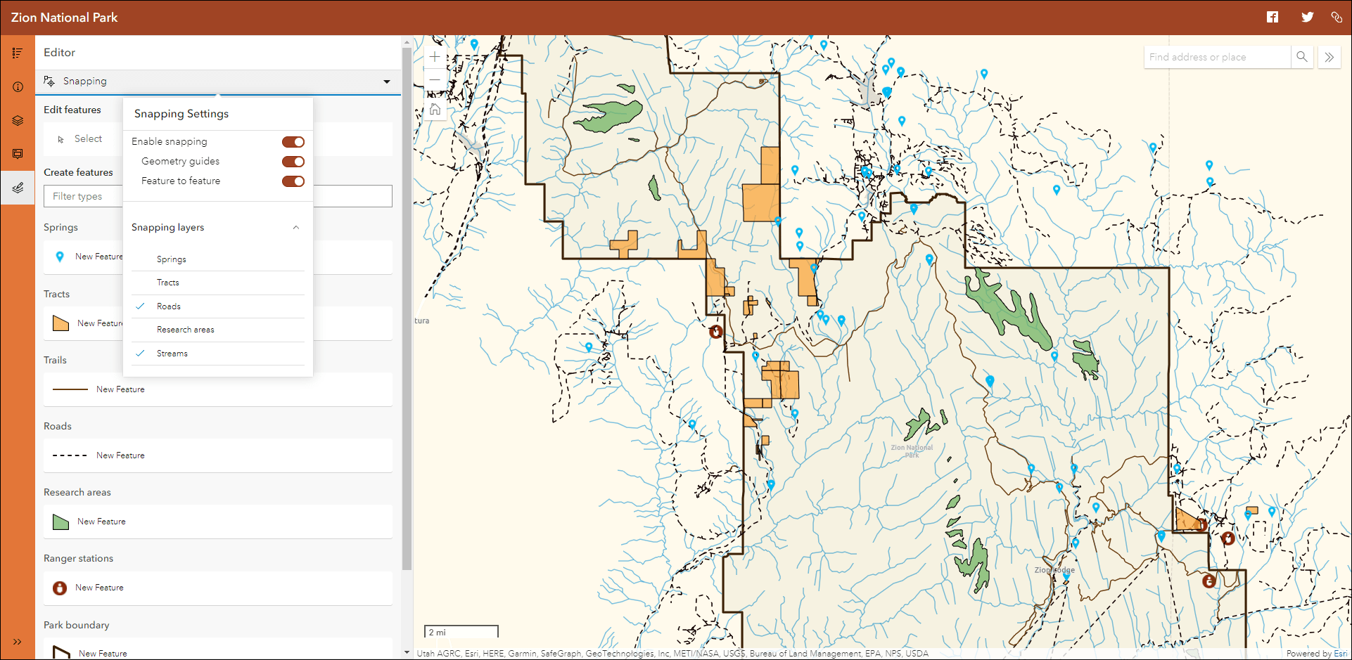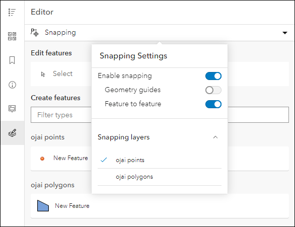 Sidebar offers a range of tools for exploring, understanding, and managing data. A panel containing these tools displays alongside the map and includes data editing, feature filtering, pop-up information, bookmarks, layer list, and more. We have added the ability to snap to features while performing editing workflows. Within the editor panel of the app, use the Snapping dropdown to configure settings such as types of snapping to perform and which layers will use it.