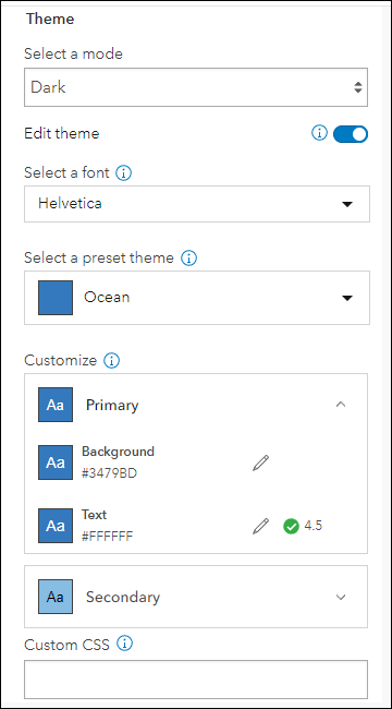 We have also added more control over customizing the theme of the app. On the Theme & Layout tab of the app configuration, enable Edit theme to access these new settings. Choose a font and a preset theme, and then choose to further customize the primary and secondary colors based on the preset theme.