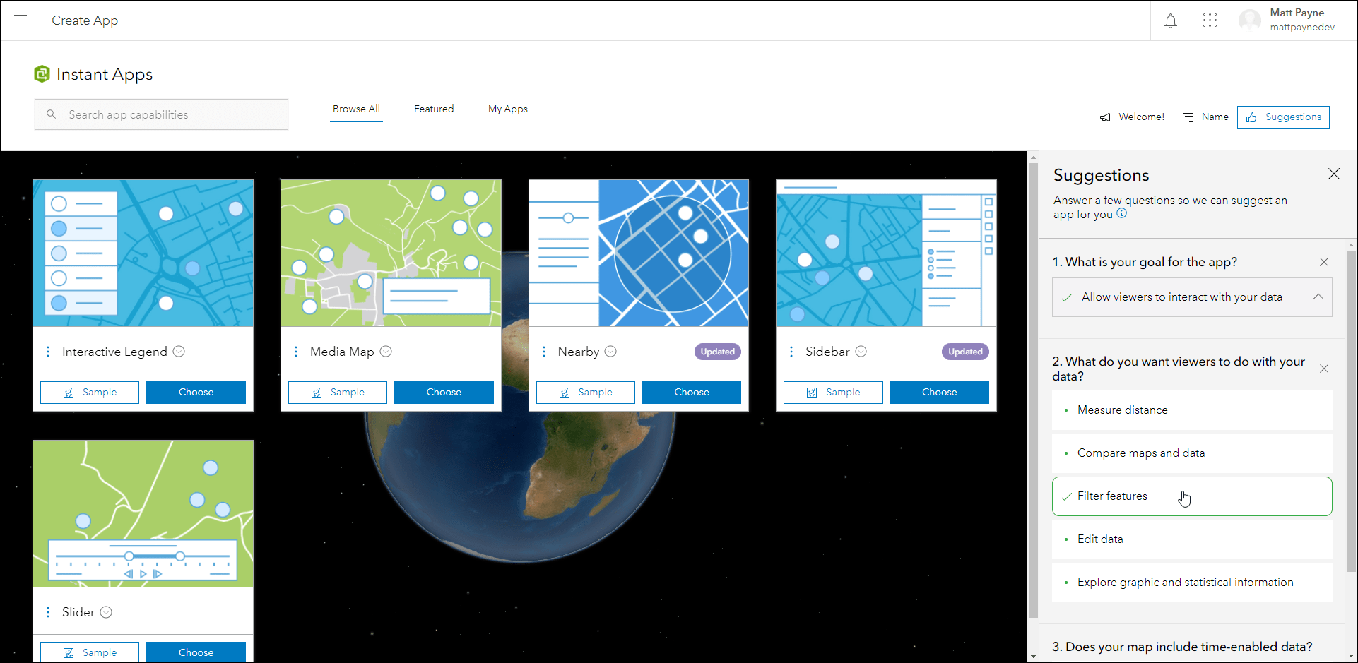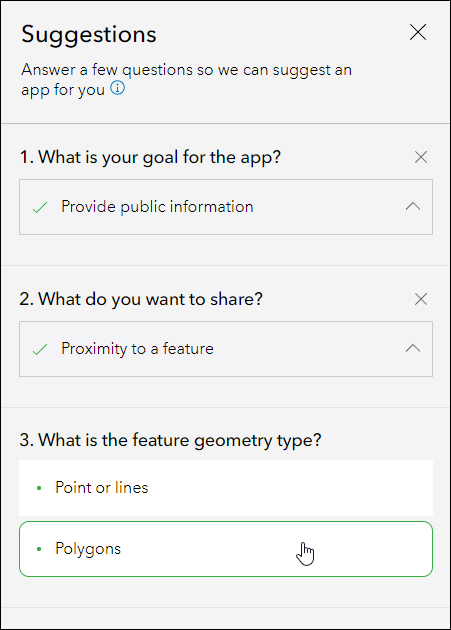 Suggestions are intended to help guide you to a more refined set of app choices. Try out this new feature and if you have any feedback about the question and answer choices, or about the experience as a whole, we would love to hear how we can improve. Provide any feedback you have on how we can help you choose the right Instant App by creating a post in our ArcGIS Instant Apps Esri Community page. We also recommend you check out our Introducing ArcGIS Instant Apps blog.