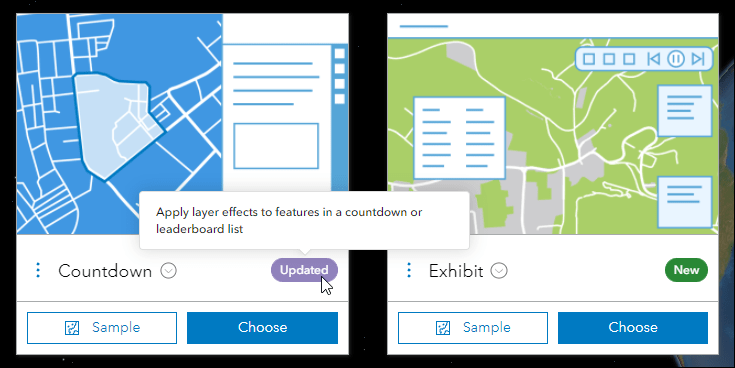 To keep up to date with other new features we have added to Instant Apps, look for the purple Updated badge on app cards on the Browse All tab. These badges have hover tooltips with information about what feature is new for that app and these are updated with each release. Also, please check out our Introducing ArcGIS Instant Apps blog.