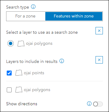 For Zone Lookup, choose between searching for a zone or searching for other features within a specific zone. For example, searching for a zone could be used to lookup what school district you are in based on a provided address location. And searching for other features within a zone could be used to find campgrounds contained inside of specific fire perimeter polygon. Similar to Nearby, we have included a toggle in the app configuration that makes it easier to choose and configure this setting.
