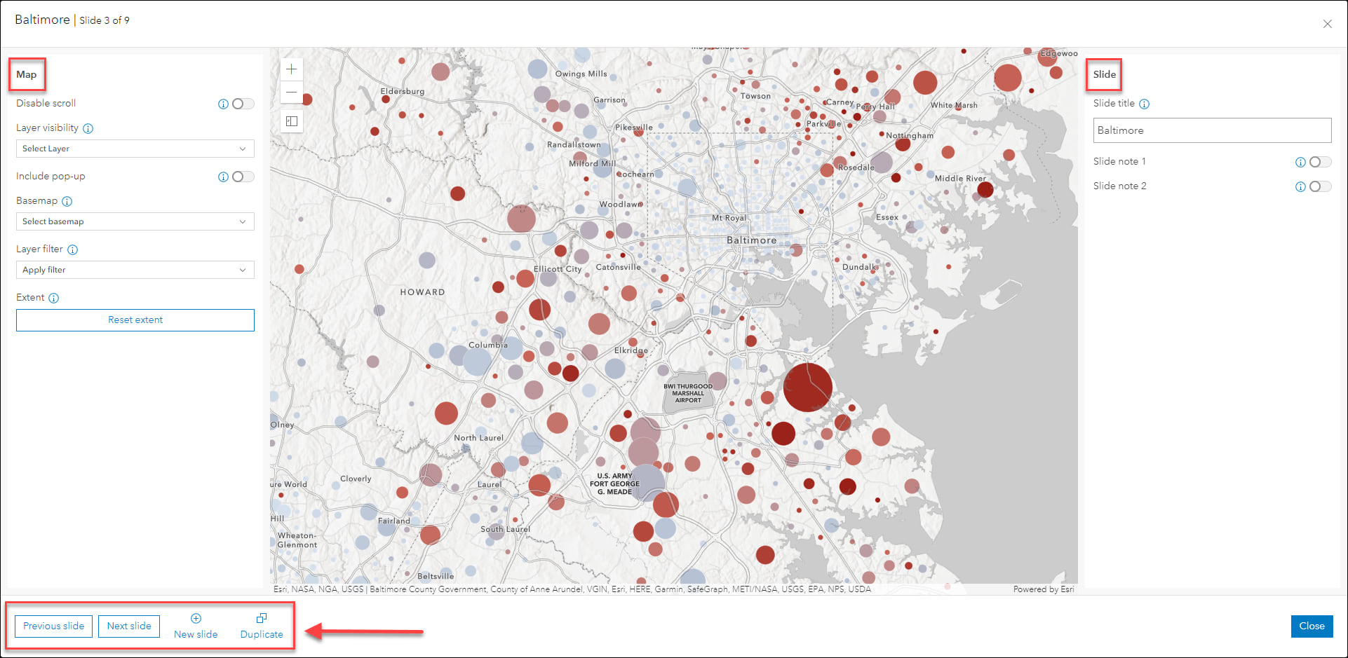 Design an interactive presentation of your map using Exhibit. Tell a linear story by choosing specific areas of your map to highlight using slides that offer interactivity options such as toggling layer visibility and choosing a unique basemap. This release we have redesigned the slide configuration to help streamline creating and editing slides without leaving the window. Toggle to previous and next slides, create a new slide, or duplicate the slide all within the same slide configuration window. Settings for both map and slide are included in the same view for a more comprehensive editing experience.