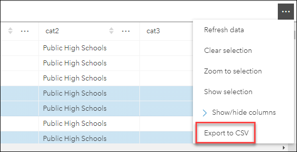 The ability to select records from a table and export to CSV has been added to 3D Viewer, Media Map, and Sidebar. This option is part of the “Add show table option” setting in 3D Viewer and Media Map in the Interactivity section, and is found on the Sidebar section of the configuration in Sidebar. When enabled, the Open table button in the layer list includes the option to Export to CSV. Note that the layer list in the app configuration must be enabled to expose the “Add show table option” setting.