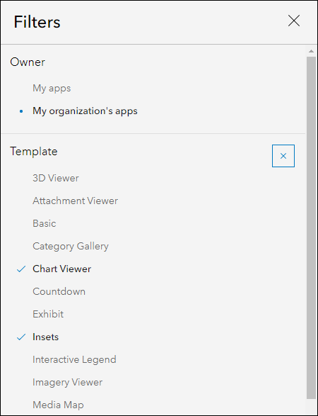 The Instant Apps home page offers a centralized place to browse, choose, create, and manage ArcGIS Instant Apps. We have included updates to several key areas of the page this release. First, the My Apps tab now offers the ability to filter apps by several different criteria. Filter for apps that you own or apps that are owned by members of your organization. Discover apps that have been created using a specific app template, for example, filter for all apps created using the Interactive Legend template. This filter lets you select multiple values so that you can view results for multiple app templates at once. Also included is the ability to filter by sharing status.