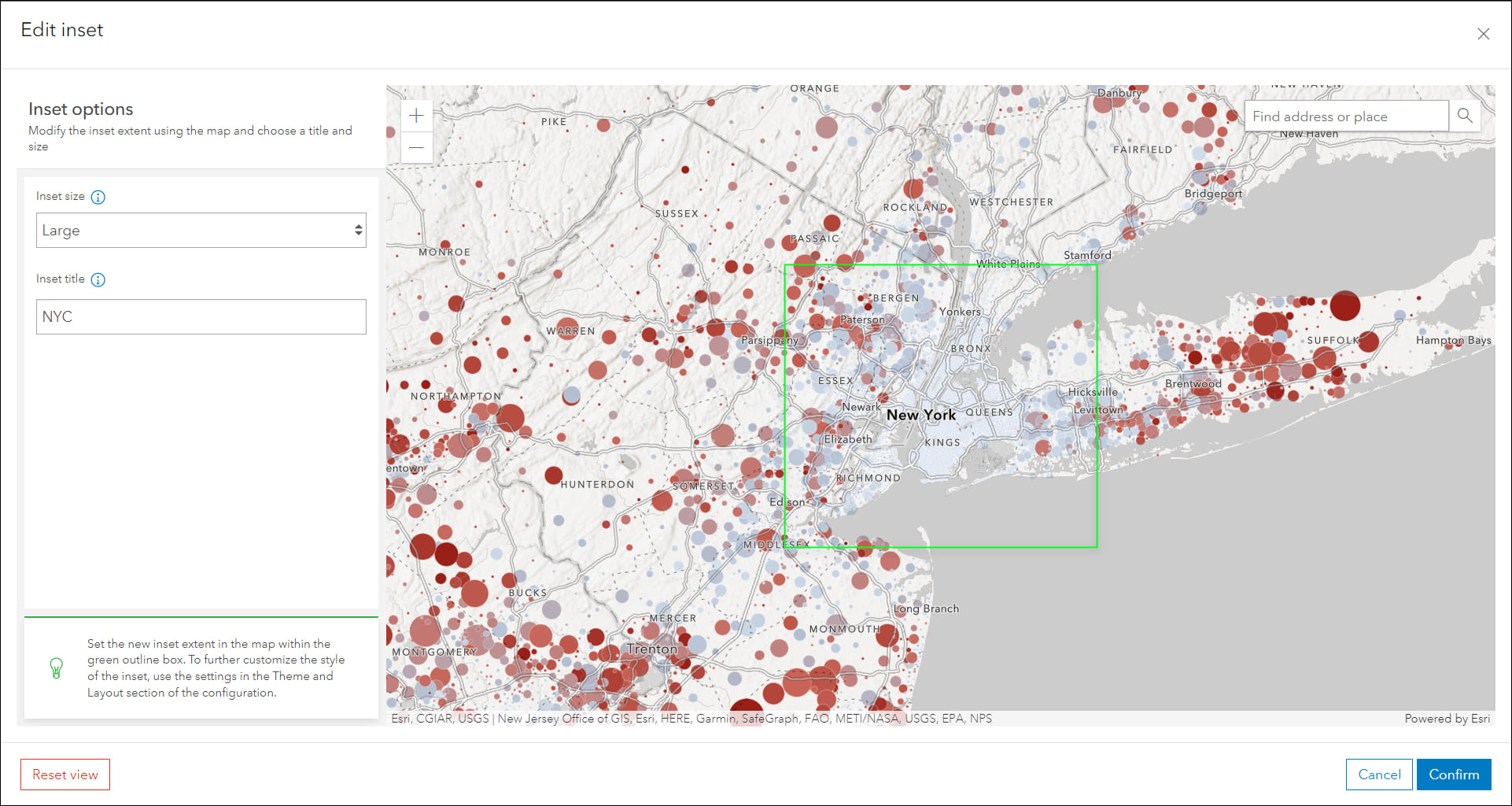 For Custom mode, configure the sizes of each individual inset within the inset’s editing window. Here is where you can set the size, title, and extent to fit your area of interest wherever it is on the map. Use the green bounding box as a guide to confirm what is contained inside the inset when the app loads.
