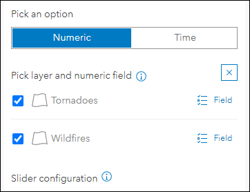 Animate through temporal or numeric data using the Slider Instant App. We’ve added the ability to animate through multiple layers at once using numeric data with this update. For example, animate through a wildfire layer and a tornado event layer at the same time based on total destruction cost to see which events had similar impacts on communities. In this example, instead of animating through time, the new update allows you to animate data using the numeric field containing destruction cost values that is common between the two layers. Find this option in the Slider section of the app configuration to enable multiple layers and select the common field.