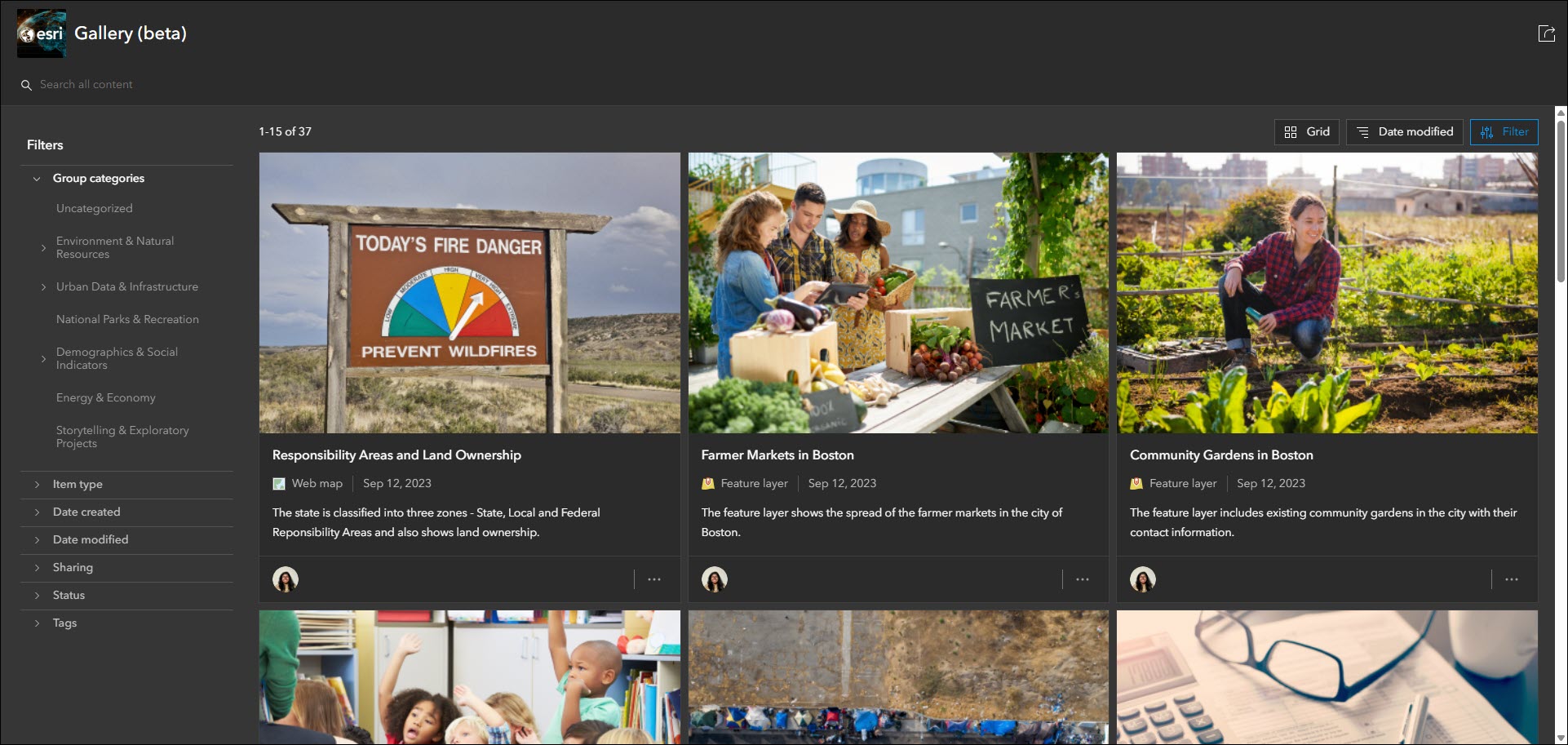 Showcase items from a group in a filterable and searchable grid or list using the new Gallery (beta) template. Present a collection of items that offer app users the ability to view, open, and explore all in one place. Gallery (beta) offers several different ways to filter content in the app using the filter panel, such as by category, item type, date created or modified, tags, and more. The category filter can be configured to use group categories or organization categories. A setting in the configuration lets the app creator decide which one to leverage in their app.
