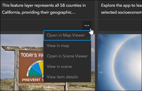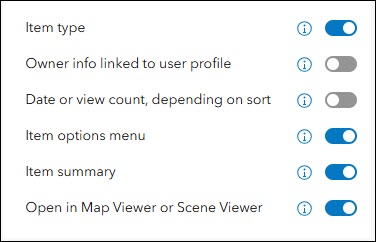 The app configuration offers several key settings beyond filtering, such as default layout (grid or list), sign in button, and the ability to open content externally from the app in the ArcGIS Online Map Viewer or Scene Viewer. Enable the “Open in Map Viewer or Scene Viewer” setting in Interactivity > Item card display to make this the main opening action on map, scene, and layer item cards. If this setting is disabled, only the app’s built-in viewers will be used to display these items.