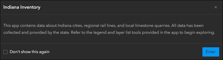 - Require dismissal each time – There is no “Don’t show this again” checkbox available. This requires the app viewer to see and dismiss the Introduction window every single time they load the app.