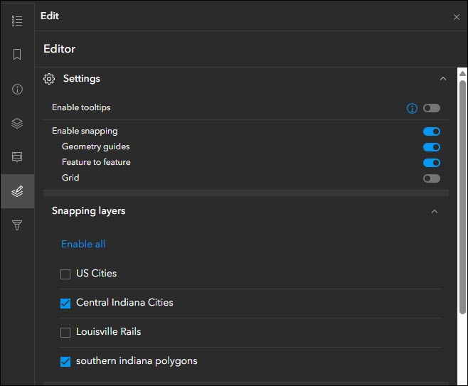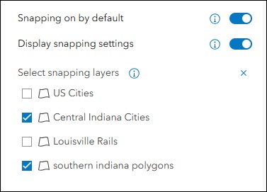 Sidebar offers a range of tools for exploring, understanding, and managing data. Configure an app that lets users carry out data editing workflows using a set of tools in the side panel of the app. In the configuration, enable the “Display snapping settings” option on the Sidebar > Editing tools tab to find the new snapping layers settings. Determine which layers from the map will participate in snapping by default. When using the app, viewers can access and modify these settings in the Edit panel as they are working.