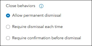 Provide app details to introduce viewers to your app using the Introduction window. Once dismissed, the Introduction window can be reopened by app viewers in the app. Take advantage of a new set of configuration options that affect how the Introduction window is presented and dismissed. On the About tab of most app configurations, enable “Introduction window” and then find the new “Close behaviors” setting.