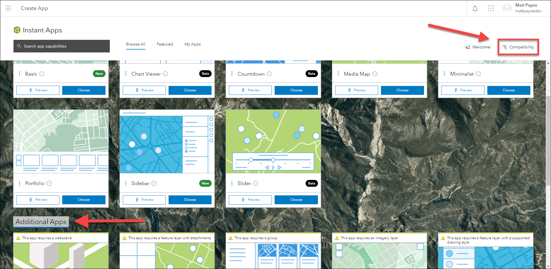 The same applies when launching the gallery from the new map viewer and web map item pages, where the compatible web map Instant Apps are listed first. Note, implementation of the Instant Apps gallery into Scene Viewer will be coming in a future release.