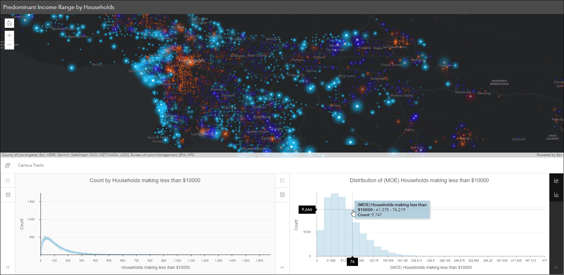 Chart Viewer (beta) leverages charts authored in Map Viewer to display data-based graphics alongside a map. This Instant App lets you include up to ten charts from the web map with configuration options for visibility, ordering, and naming of charts. Choose between two layout options, stacked or side by side, to best orient the charts panel with the map. App viewers can display up to two charts at a time in the charts panel to help understand and visualize the data. Select features in the map or data in the charts to further analyze specific segments of information.