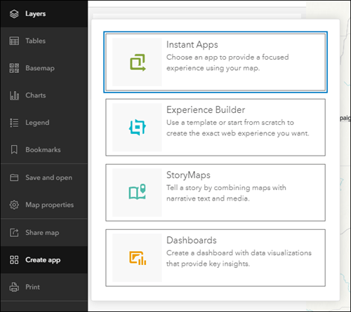 For a detailed run through, please check out our Introducing Sidebar blog. Create a Sidebar app from the map viewer, Content page, or web map item page by choosing Instant Apps from the Create App menu.