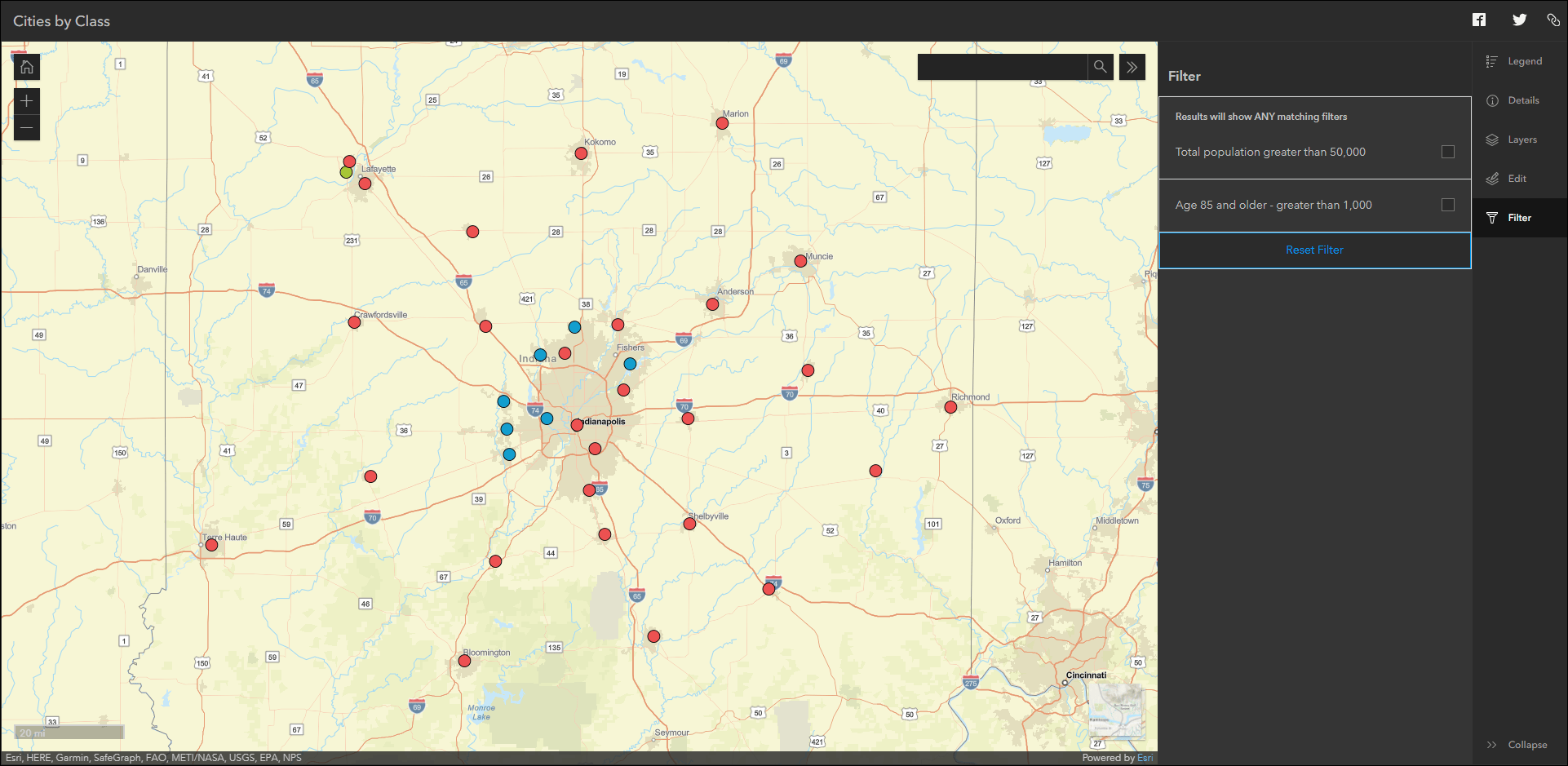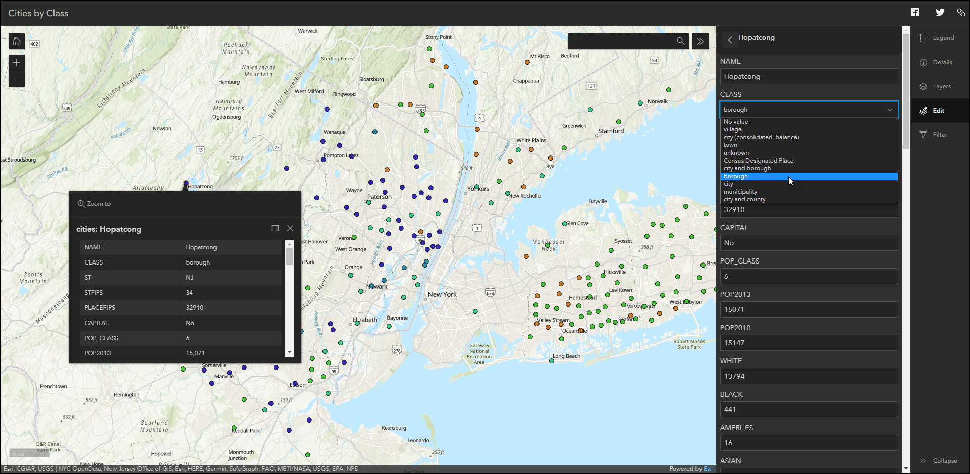 Sidebar is a new Instant App offering a range of tools for exploring, understanding, and managing data. A panel containing these tools displays alongside the map and includes data editing, feature filtering, pop-up information, bookmarks, layer list, and more. If your map contains editable feature layers, they will appear in the Edit panel with options to add a new feature or edit the geometry and attributes of a selected feature. As an app creator, preconfigure one or more filters to be utilized by the app viewer so they can further understand information in the map.