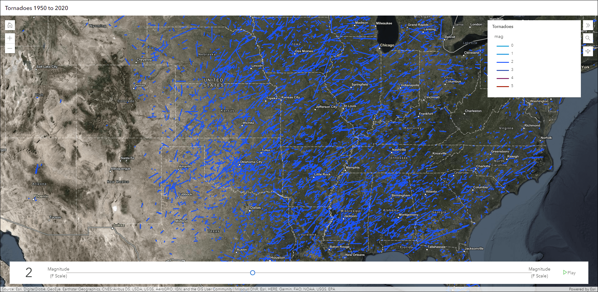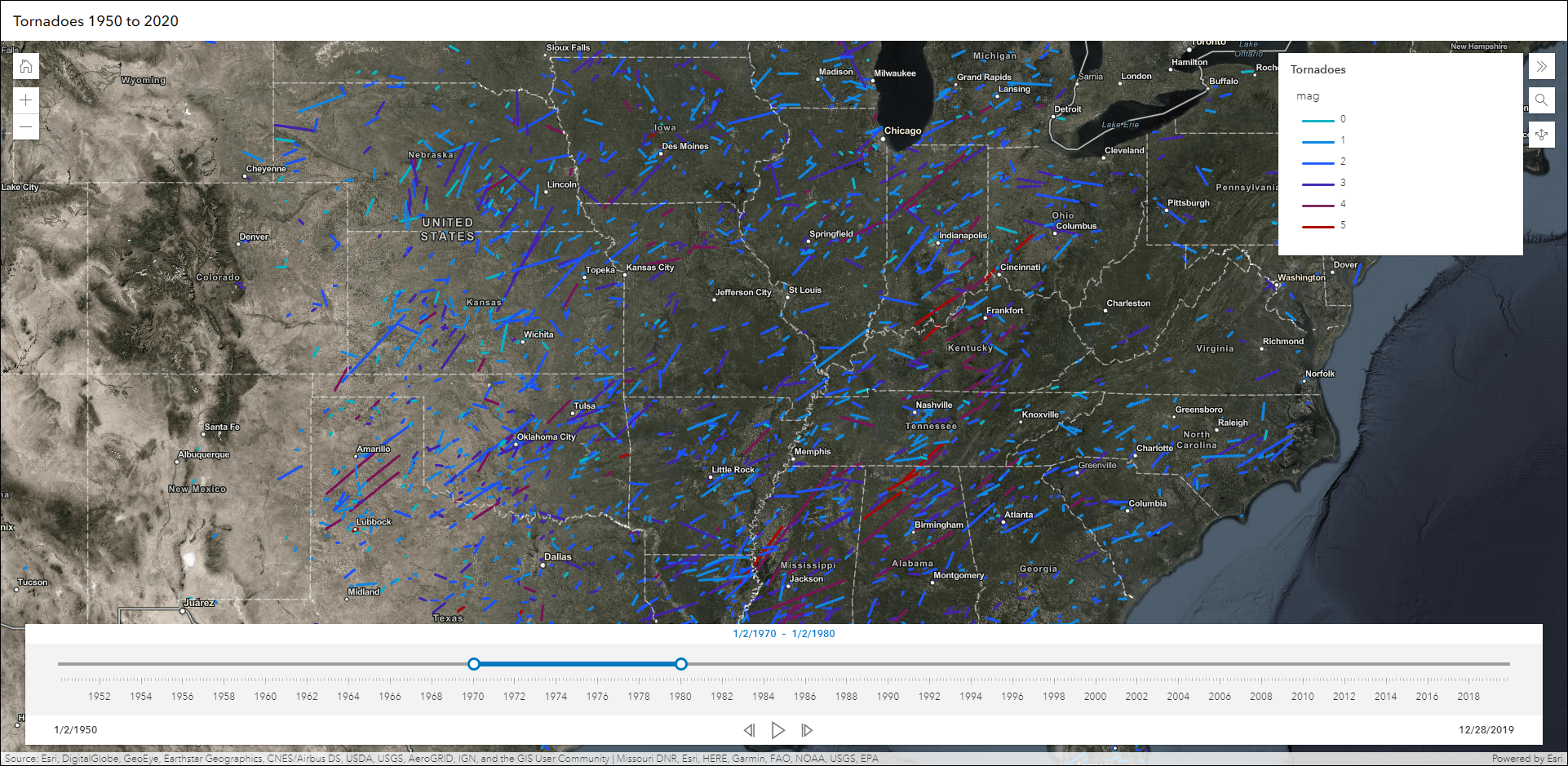 Animate through temporal or numeric data using the new Slider (beta) Instant App. Display historical, live, or future data over any interval of time, including hourly, daily, monthly, annually, and intermittent. The app configuration offers the choice of using numeric or time data, and the ability to pick the desired layer and field containing the data. For example, animate through historical tornado data by decade of occurrence, or choose to play through the data by magnitude value to see where tornadoes that are stronger occur less frequently.