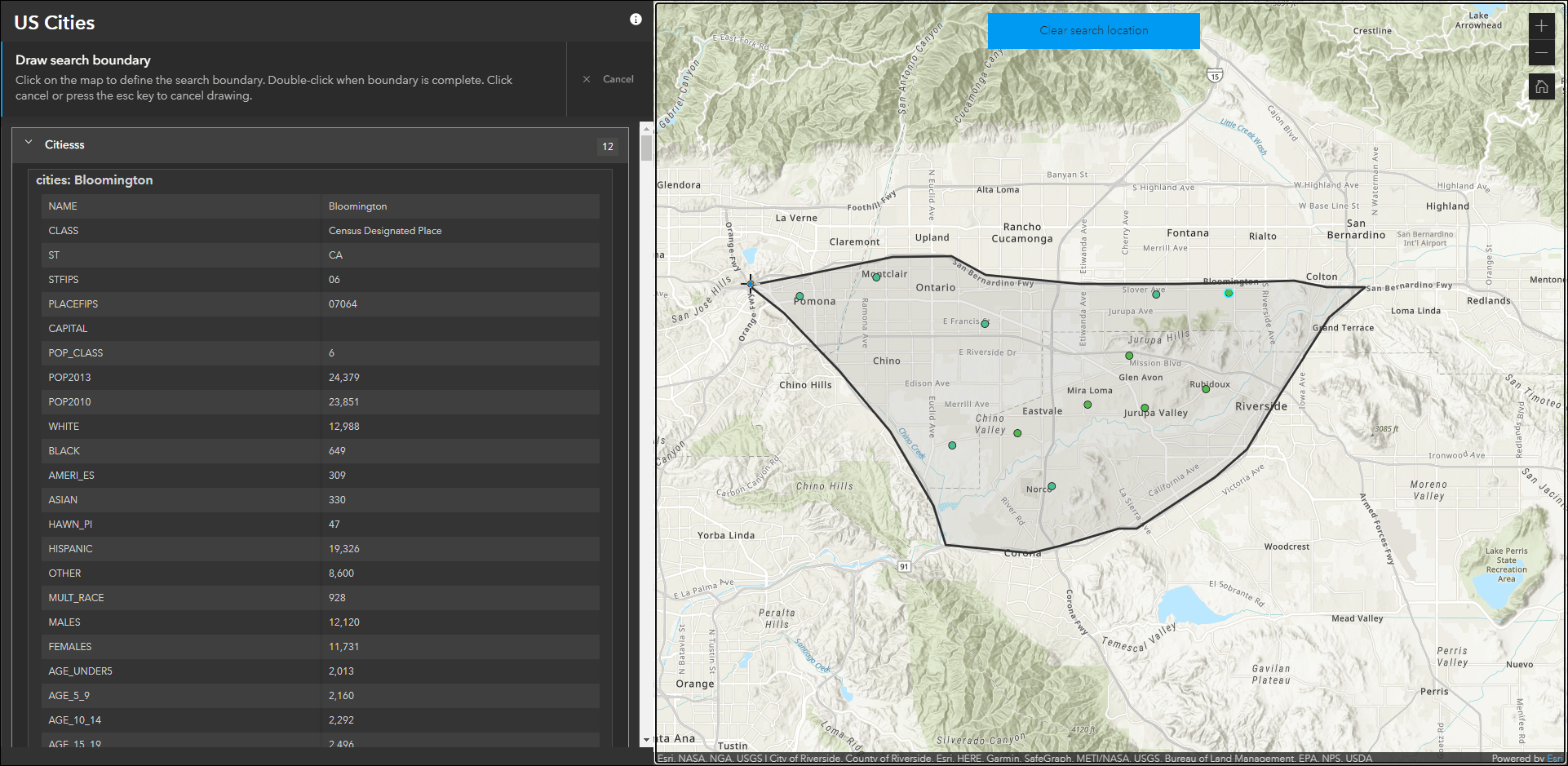 Also new is the ability to draw a polygon boundary to be used as the lookup zone. In the app configuration enable the “Draw a zone” option to display a draw tool for creating a custom boundary to find resulting features within.