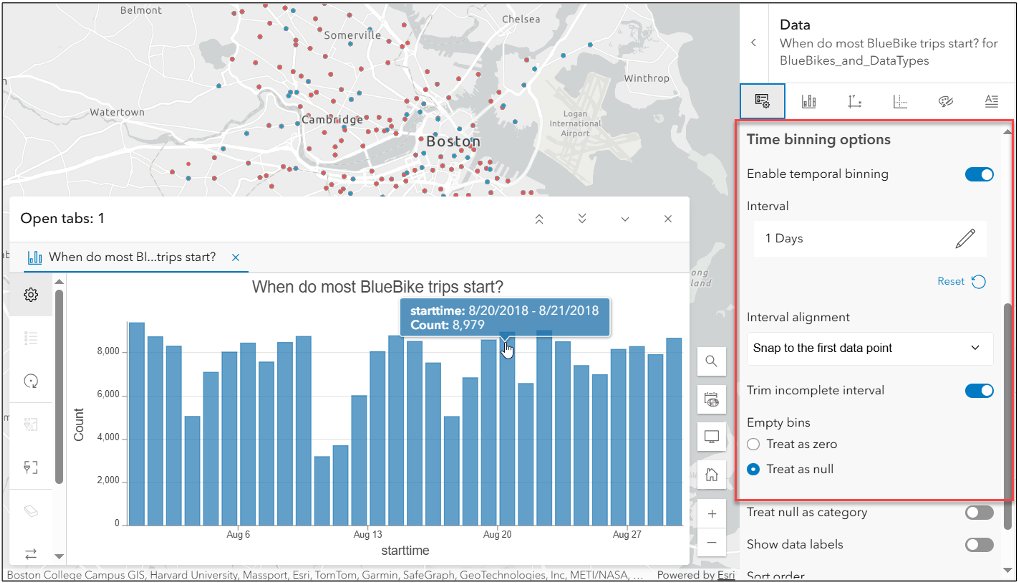 Map Viewer’s latest update brings powerful new charting capabilities that make data storytelling more precise. Bar charts now support temporal binning, allowing time-based data to be grouped into meaningful intervals for clearer trend analysis. A new option to Display Null as a Category ensures no data is left behind, giving visibility to missing values.