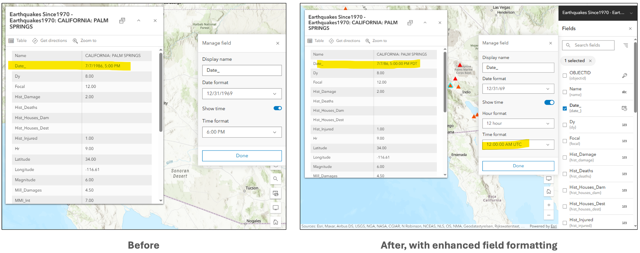 Map Viewer now offers enhanced field formatting for hosted feature layers to better align with internationalization standard for date and numeric fields. These improvements allow dates and numbers to dynamically format based on the viewer’s locale, ensuring clarity and consistency across regions. You can also specify time zones for date and timestamp offset fields directly from the map’s properties panel. Together, these options make it easier to present data in a way that’s accurate, regionally relevant, and user-friendly.