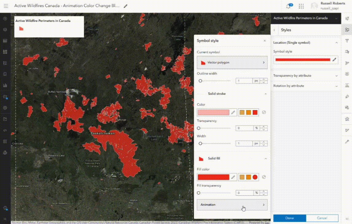 With the animated symbol gallery, you can fine tune symbol animations—adjusting color, transparency, rotation, and scaling—to achieve the perfect look. The expanded collection of animated line and polygon symbols helps you better convey dynamic scenarios and events, such as movement or change over time.