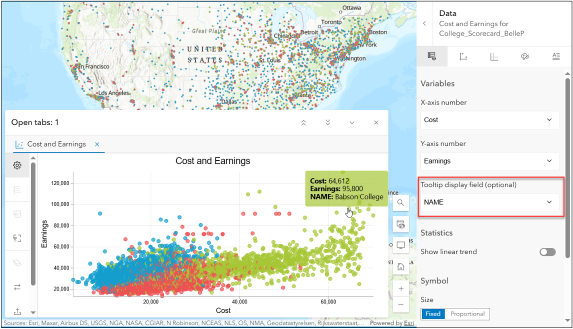 Plus, when working with scatterplots, you can now add an optional tooltip field to show extra details, such as school names, making it easier to identify each point. Check out this blog for more details on our latest updates to charts in Map Viewer.