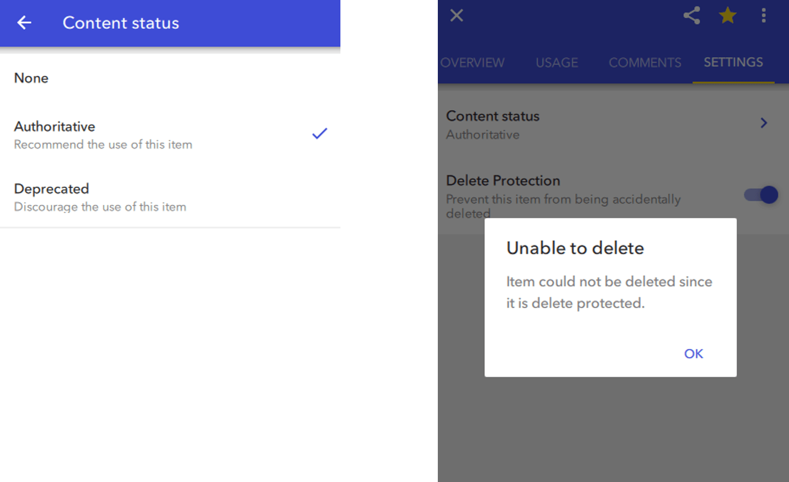 - Ability to mark an item’s Content Status as Authoritative or Deprecated – Administrators can update the content status of an item as “Authoritative” or “Deprecated”. However, non-administrators can only mark an item’s content status as “Deprecated”.