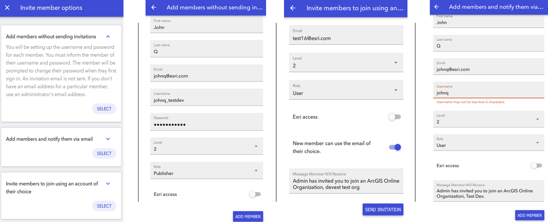 Members with administrative privileges can now take advantage of adding or inviting members using any of the available options in ArcGIS Online.