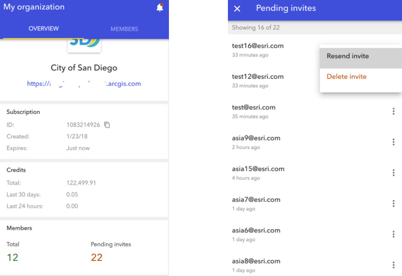 You can view the number of pending invites in the overview section of the My Organization page. In the Pending Invites page, you can view details of each invitation and optionally resend or delete.