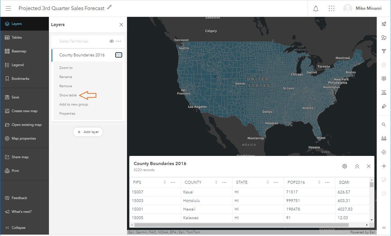 If you’ve been using Map Viewer Beta, you may notice the Table button on the Settings toolbar (right side) is gone. Now, to open a table, you’ll use the Contents toolbar (left side) to open the Layers pane and select ‘Show table’ in the options menu.