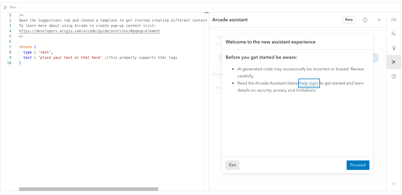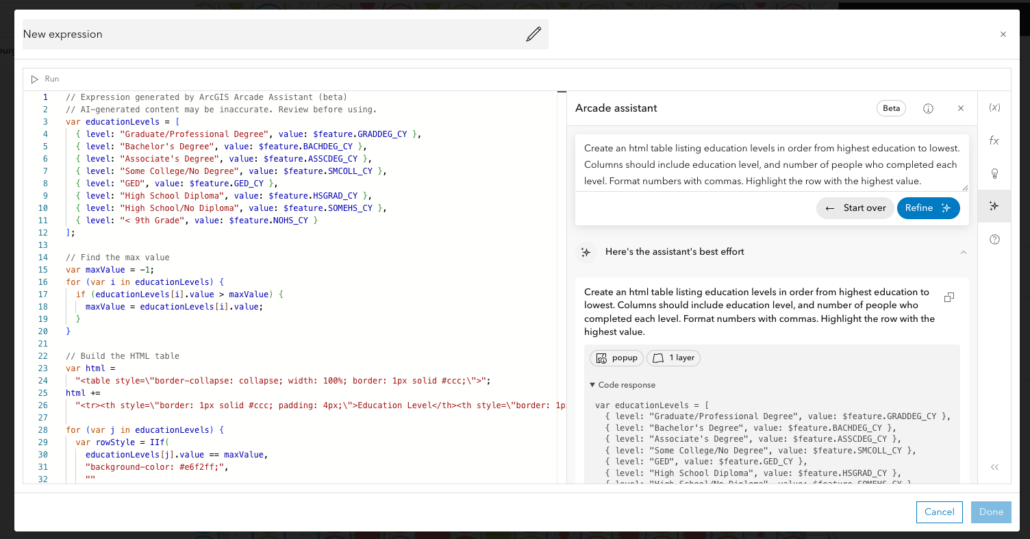 The Arcade assistant uses artificial intelligence (AI) to generate ArcGIS Arcade expressions from instructions typed in natural language. This capability is currently only available in ArcGIS Online Map Viewer.